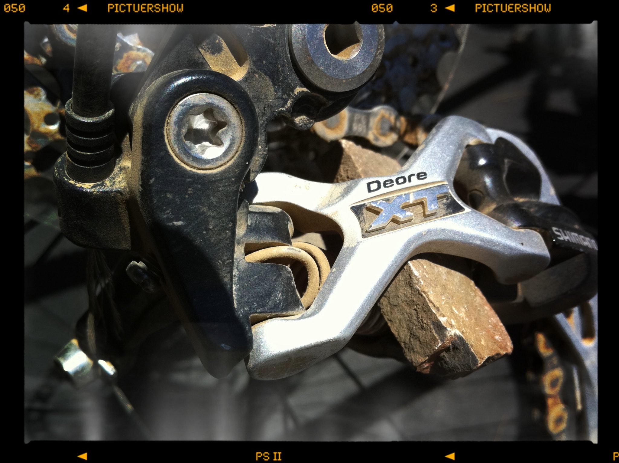 After my dérailleur cable snapped, I wedged a rock in there to provide a decent gear.