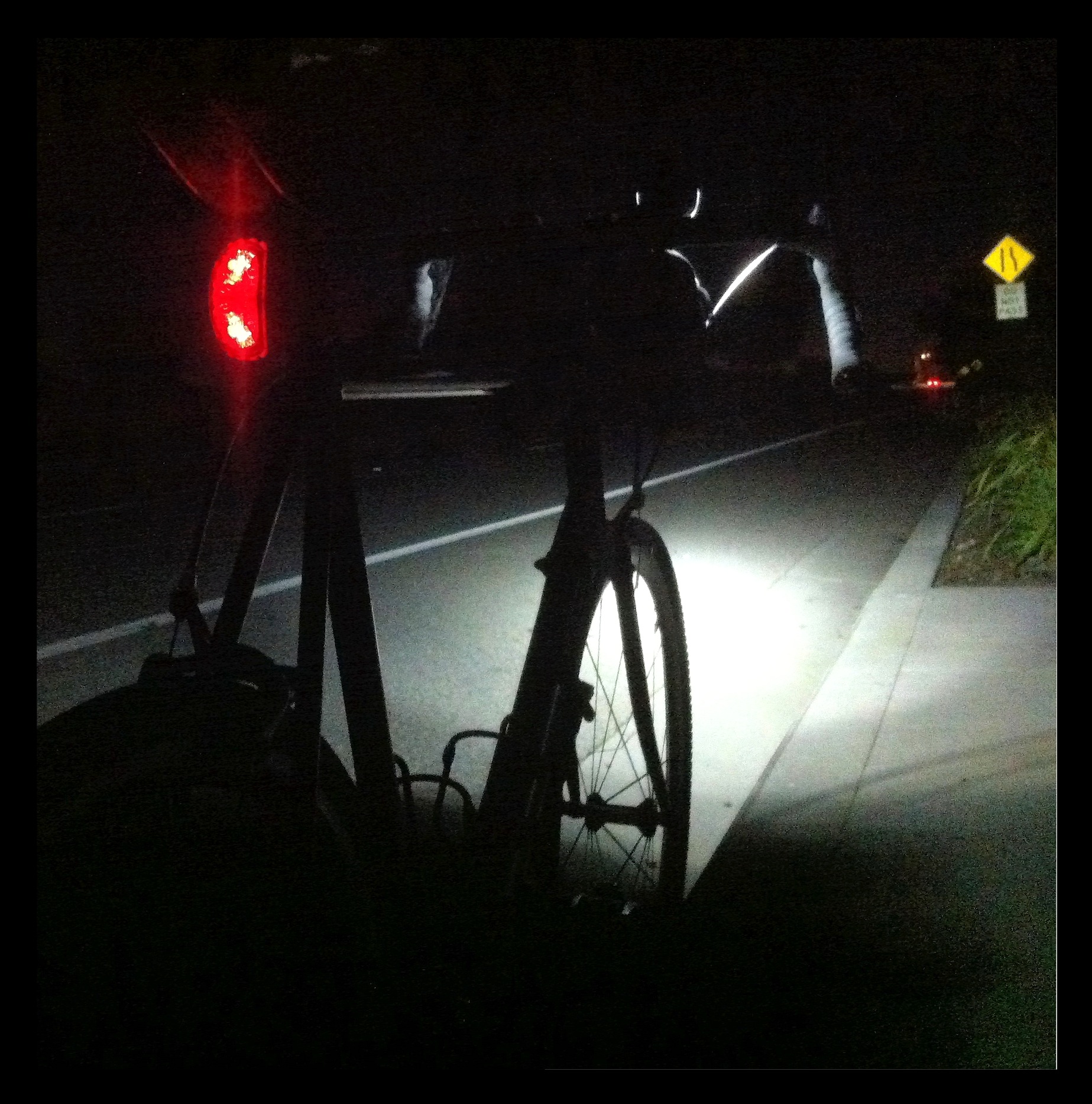 Well the photo doesn’t really do it justice, but the headlight on my bike is enough to make some motorists flash their high beams at me. Nevertheless, at 40mph, road hazards such as pine cones can come up pretty quickly.