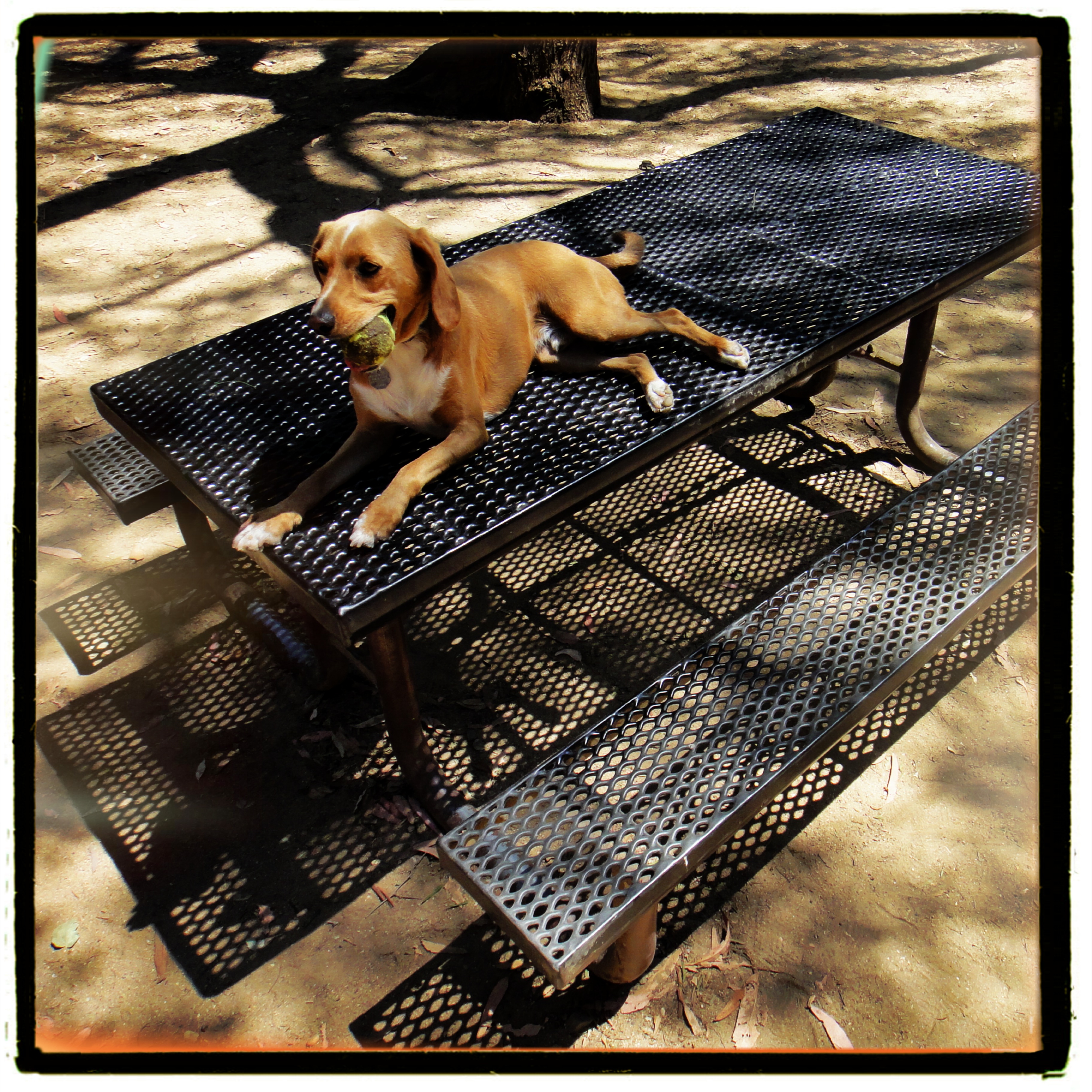 Buddy loves to jump and has discovered he can get up on the picnic table at the dog park in a single pounce. He started out by first jumping onto the seat, then the table, then realized he can bypass the seat all together.